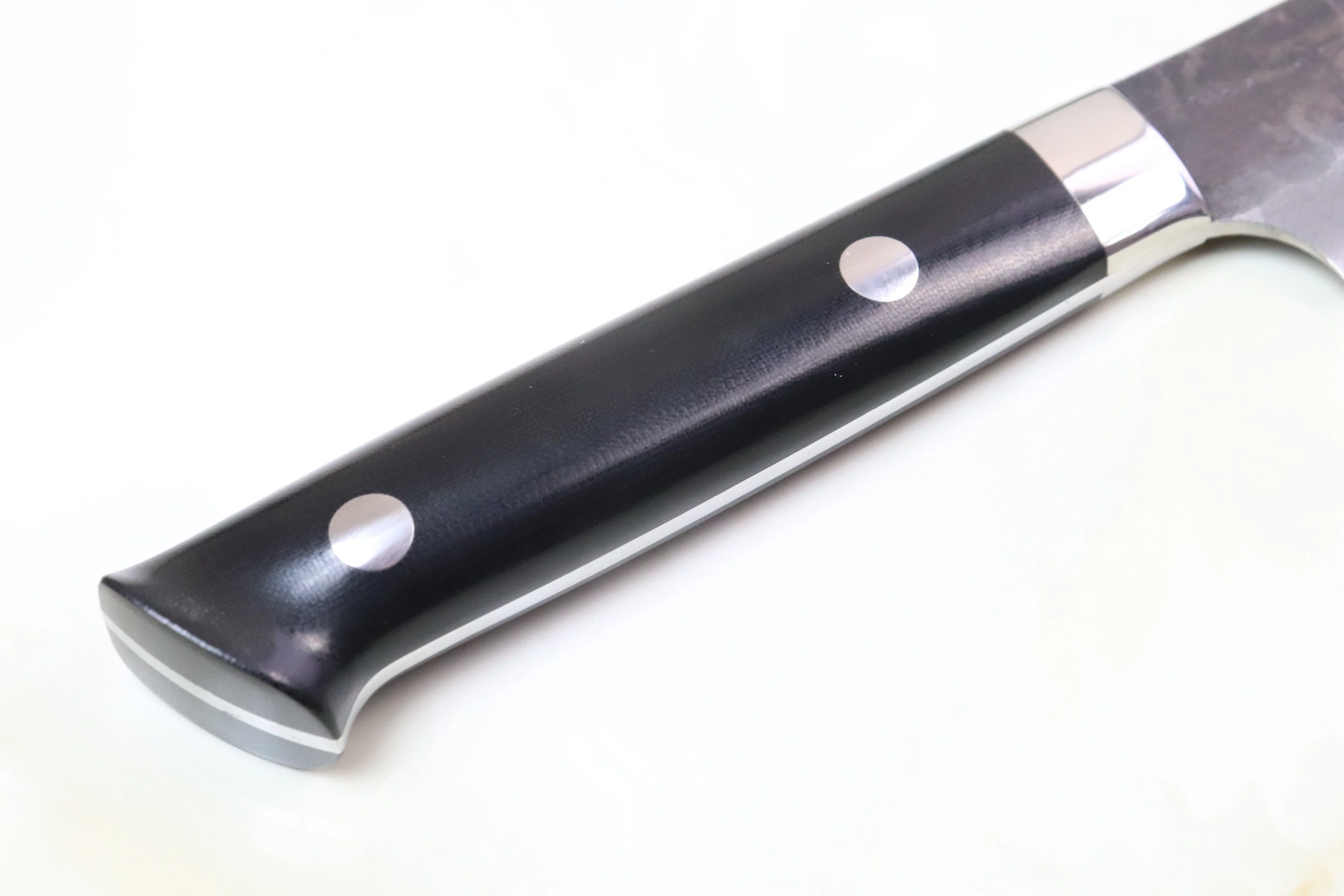 The “Aogami Super Black Forged Knife” has a blade core of Aogami Super that is sandwiched between two layers of corrosion-resistant soft stainless steel. The laminated blade is decorated with a Tsuchime (“Hammered pattern”) texture and a traditional Japanese Kurouchi (“Literally, “Black-forged”) finish that ads a touch of rustic style. This knife is available with black linen Micarta® handle scales that beautifully match the black and grey tones of the Kurouchi finish or ‘Linen Micarta® is a very practical handle material for kitchen knife because it is very durable, resistant to both water and shrinkage and provides good traction even when it is wet. The handle is carefully contoured by hand to ensure that it can be gripped comfortably and are fitted with a stainless steel bolster for improved durability and blade balance.