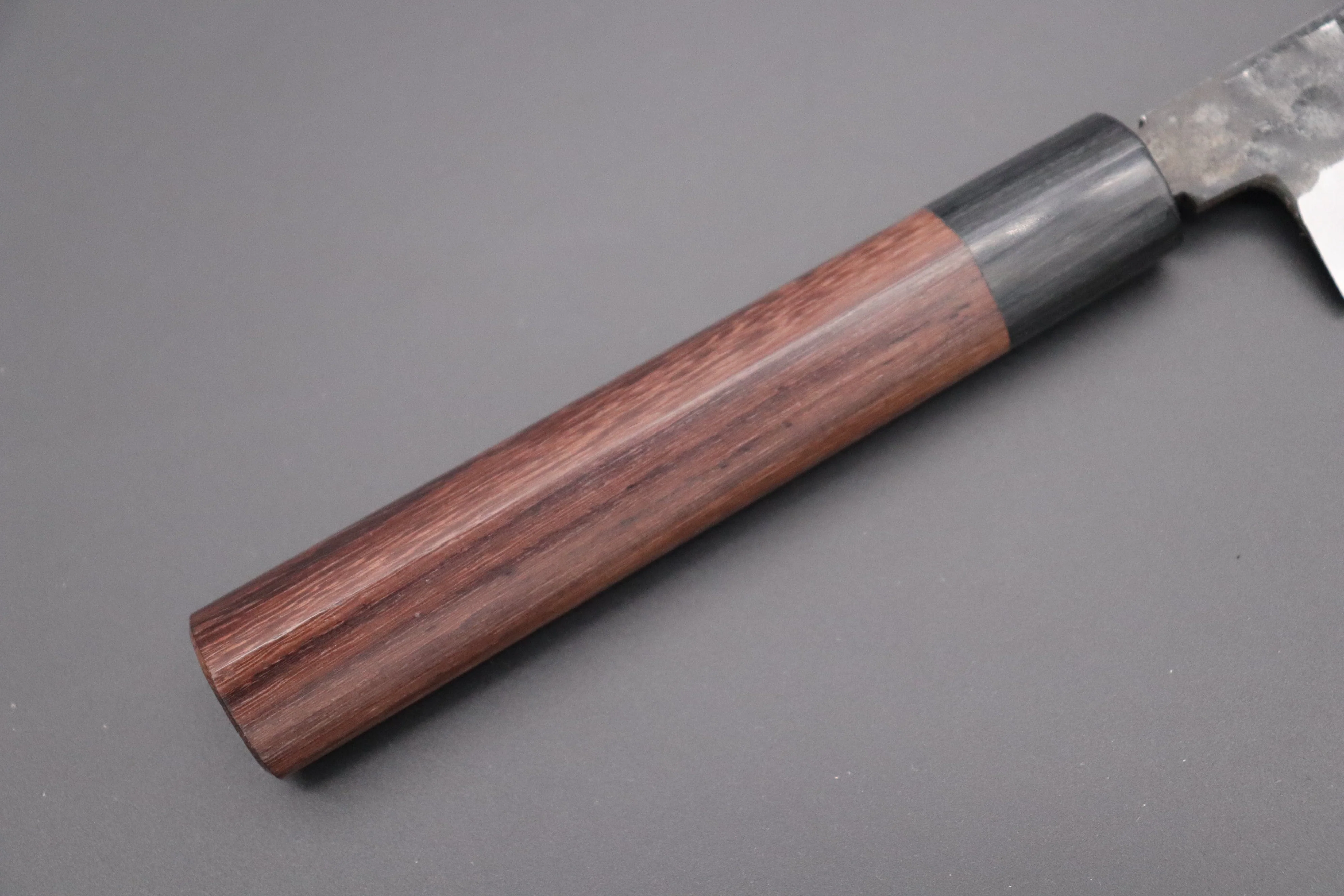 Very impressive and the unique Kurouchi (“Black-forged”) finish of the blade and its beautiful color gradation. The Kurouchi finished section of the blade (See Top-half) also has a unique Tsuchime (“Hammered pattern”) texture. It contrasts beautifully with the cloudy grey colored Kasumi (“True mist”) finished upper blade bevel and the shining silver of the polished cutting edge.